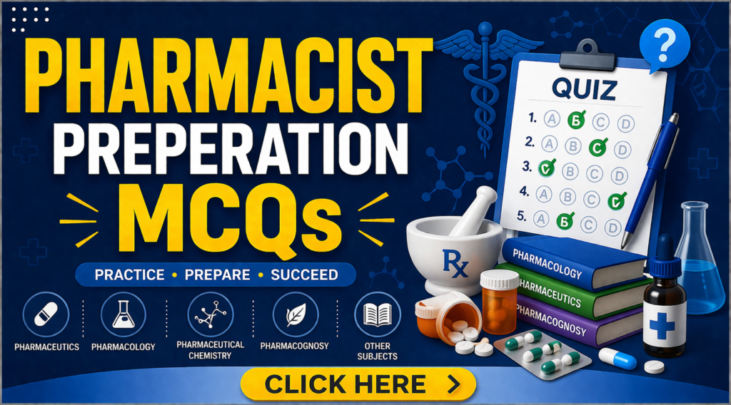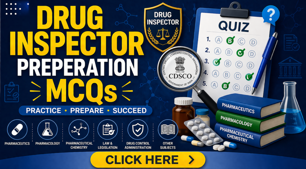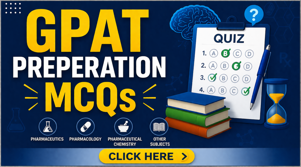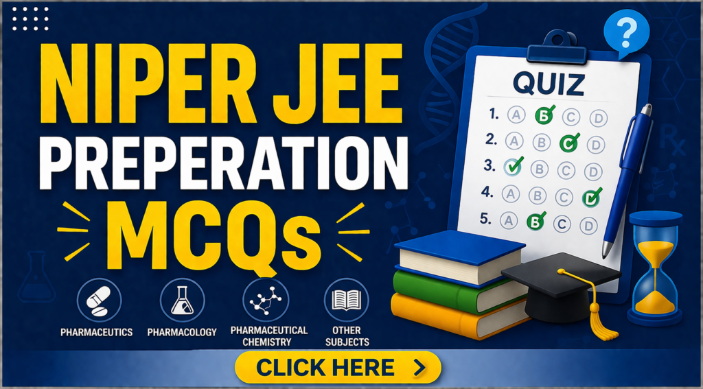 GPAT Practice GPAT subject-wise serial MCQs and take your preparation to the next level. Click here NIPER JEE Practice NIPER JEE subject-wise serial MCQs and boost your exam preparation effectively. Click here PHARMACIST Practice Pharmacist exam subject-wise MCQs and strengthen your concepts daily. Click here DRUG INSPECTOR Practice Drug Inspector exam subject-wise MCQs and master every concept with confidence. Click here